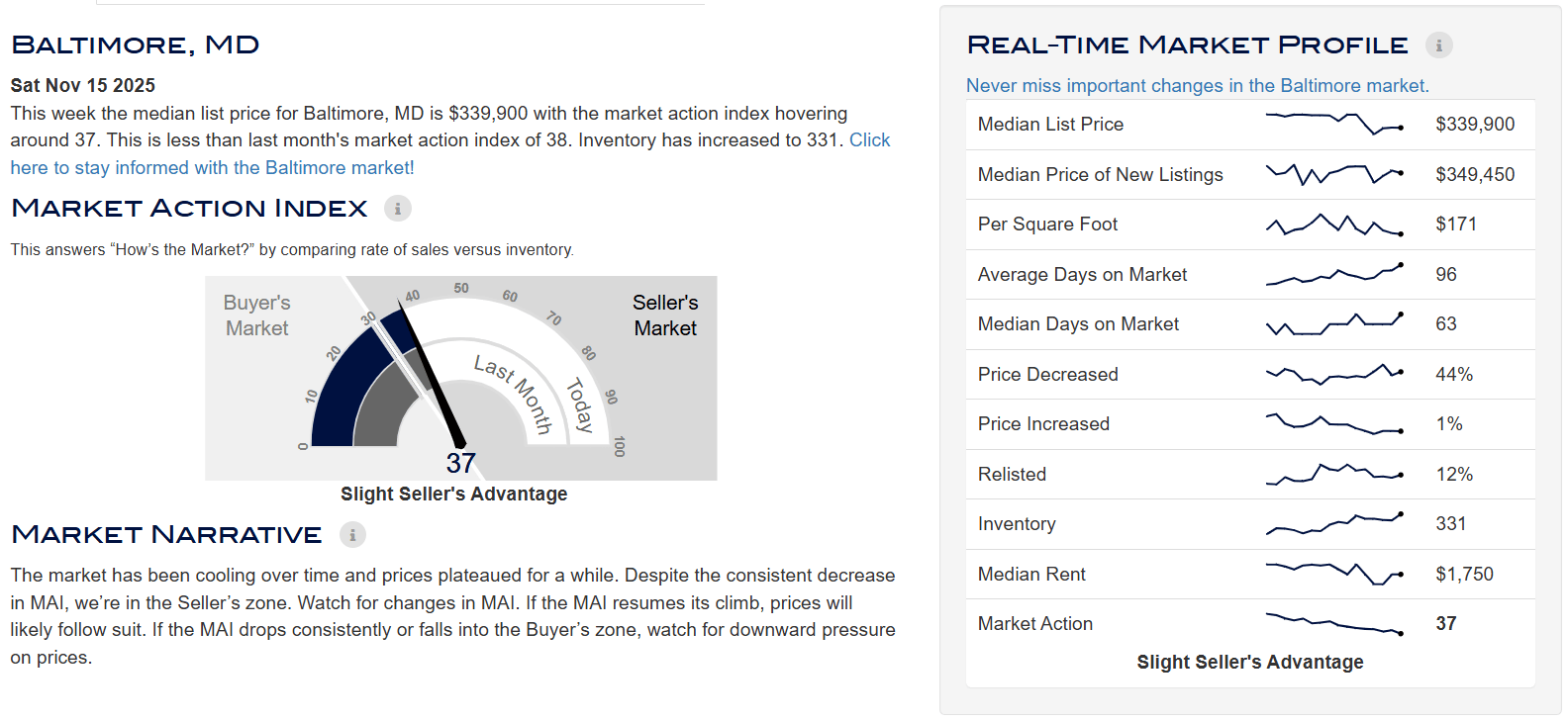 In Baltimore, the median home price is around $221K, down 3.9% from last year. Homes sell in about 46 days, with a sale-to-list ratio of 101%. Prices are easing slightly, but competition remains moderate.