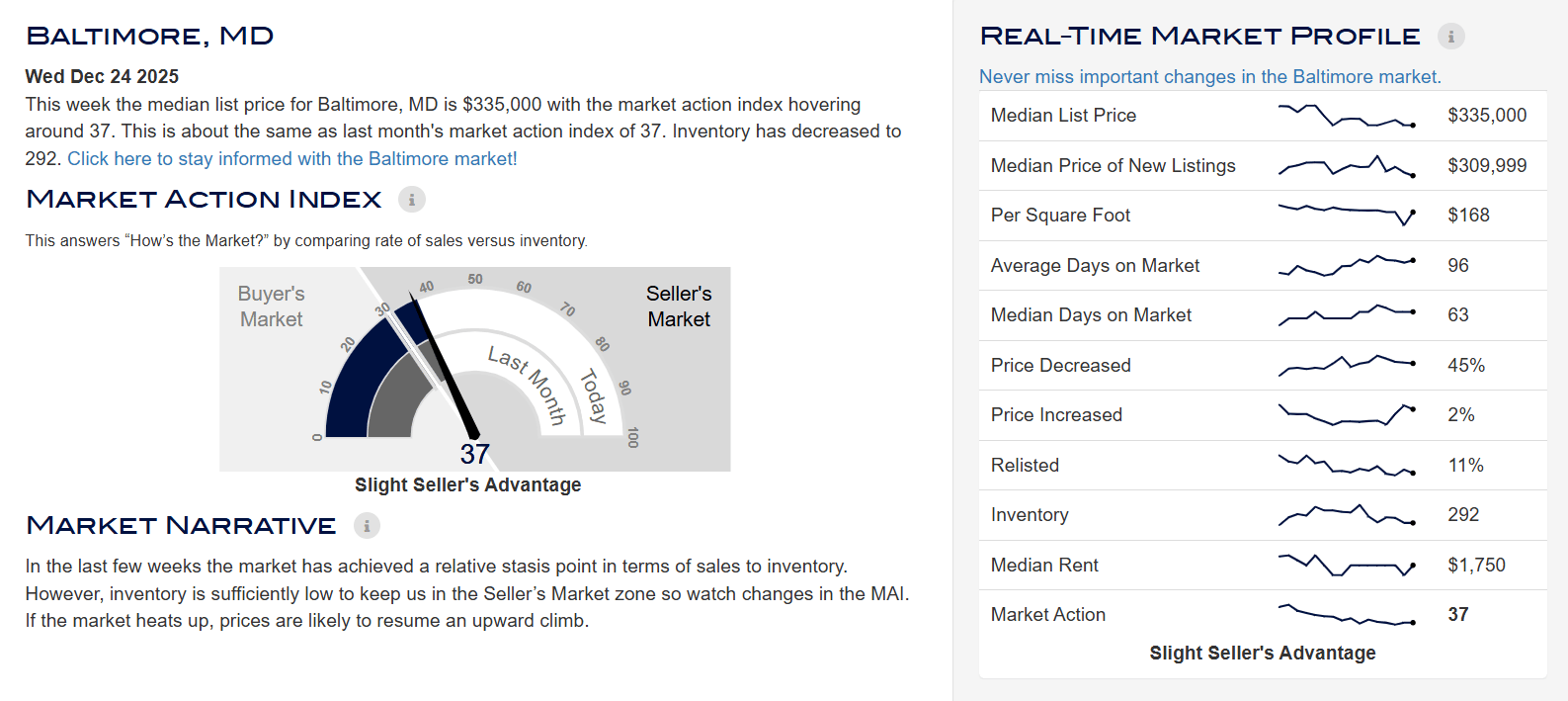 Baltimore’s market is holding steady with rising prices and moderate competition. The median home sits around $240,000, up 9.1% year over year, with homes getting about two offers and selling in roughly 49 days. It’s a market that rewards strategy and timing, not rushing.