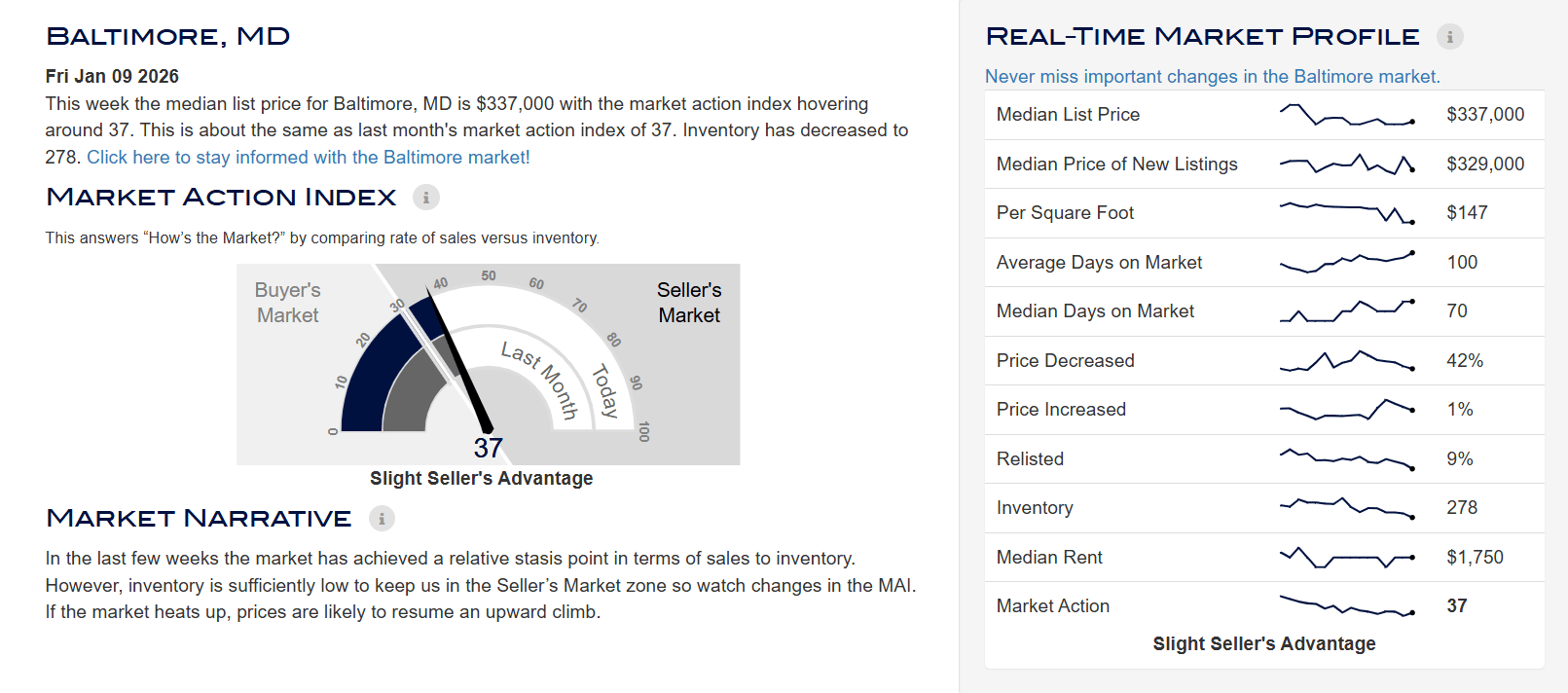 Baltimore’s market is holding steady with rising prices and moderate competition. The median home sits around $240,000, up 9.1% year over year, with homes getting about two offers and selling in roughly 49 days. It’s a market that rewards strategy and timing, not rushing.